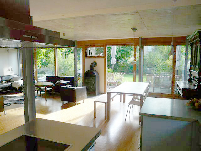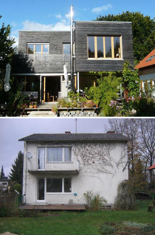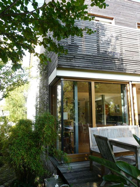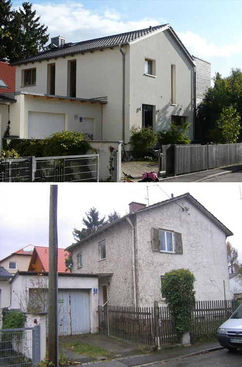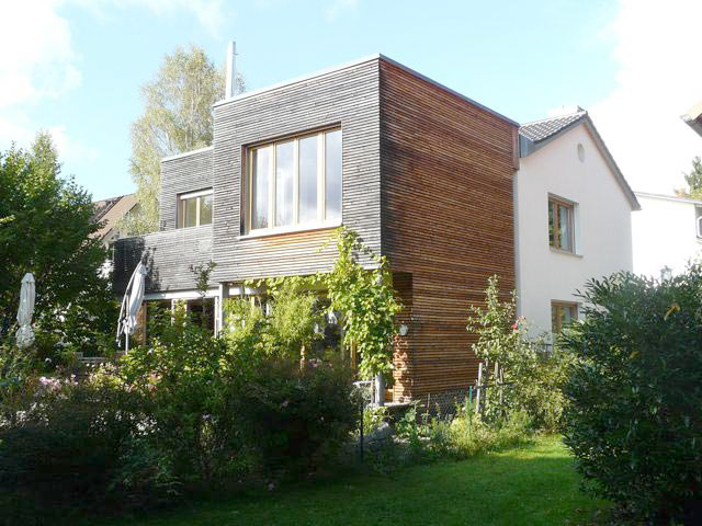 Das typische Nachkriegs-Siedlungshaus genügte den Anforderungen einer 5-köpfigen, modernen Familie nicht mehr. Durch zweckvolle Anordnung der Funktionsbereiche konnte der Altbau integriert werden. Die Kosten der Sanierung mit Anbau lagen hiermit weit unter denen eines kompletten Neubaus. Die Bauherren legten Wert auf eine spürbare Trennung in Material und Formensprache zwischen Bestand und Anbau.